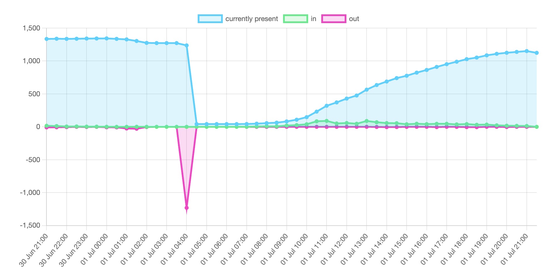 <figure><img src="https://55689121-files.gitbook.io/~/files/v0/b/gitbook-x-prod.appspot.com/o/spaces%2FMH0qx2kDusOMcs9TvihF%2Fuploads%2Fgit-blob-a9b11de5eaeecd293043df654d13918730a1140c%2FScreenshot%202023-11-11%20at%2015.24.08.jpg?alt=media" alt=""><figcaption><p>This graph shows you how many people were checked in, check in and check out actions per time duration. The red spike down was the "automatically check out everybody at a certain hour" action performed by the servers.</p></figcaption></figure>